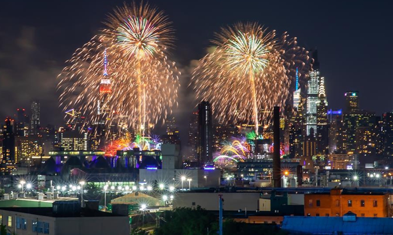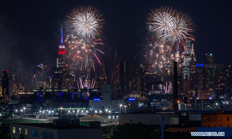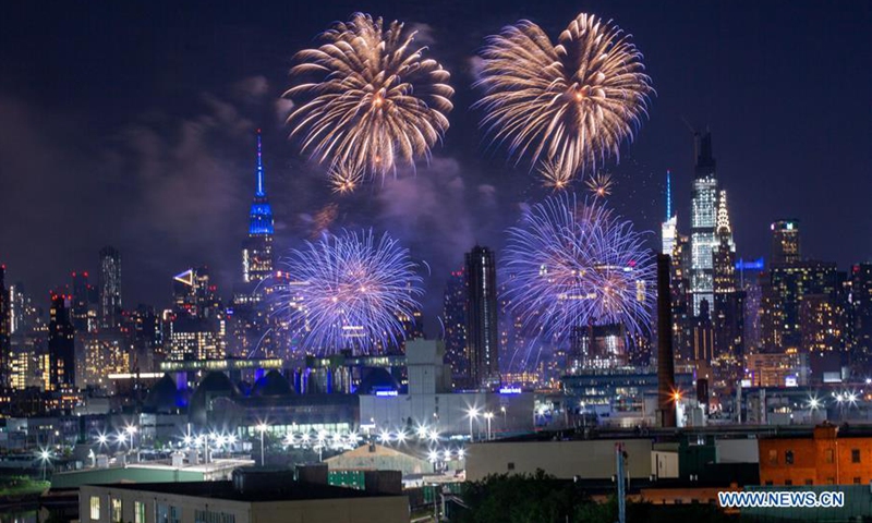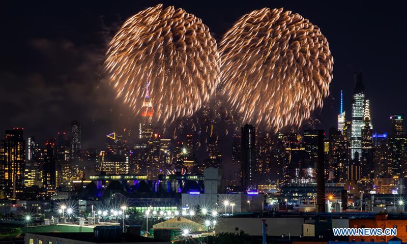 Fireworks explode in the sky to celebrate the upcoming Independence Day in New York, the United States, June 29, 2020. The annual Macy's 4th of July firework show features a series of smaller unannounced displays in every borough of New York City this year to prevent spectators from gathering during the COVID-19 pandemic. (Photo by Zhao Hailang/Xinhua)