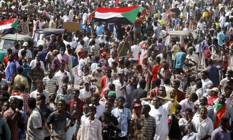 People take part in a mass demonstration in Khartoum, Sudan, June 30, 2020. Tens of thousands of Sudanese protesters on Tuesday demonstrated in Khartoum and other cities, demanding for political reforms and democratic transformation. (Photo by Mohamed Khidir/Xinhua)