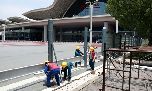 Workers install a safety fence for the Line 19 subway of Wuhan, capital of Central China's Hubei Province, on Tuesday. As the COVID-19 epidemic has subsided in the city, work on the subway project, which was to have begun service in March, officially resumed on Wednesday. Photo: cnsphotos