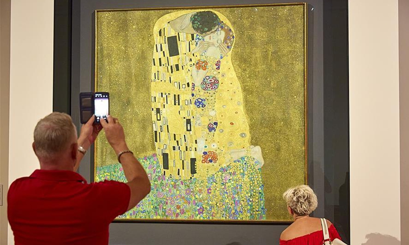 People view The Kiss (Lovers) by Gustav Klimt at the Upper Belvedere in Vienna, Austria, on July 1, 2020. The Upper Belvedere reopened to visitors on Wednesday after a temporary closure due to the COVID-19 pandemic. (Photo by Georges Schneider/Xinhua)