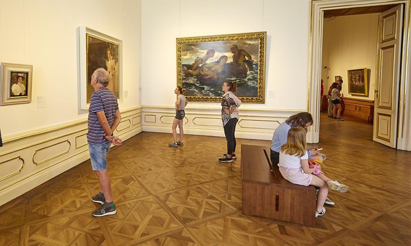 People view paintings at the Upper Belvedere in Vienna, Austria, on July 1, 2020. The Upper Belvedere reopened to visitors on Wednesday after a temporary closure due to the COVID-19 pandemic. (Photo by Georges Schneider/Xinhua)