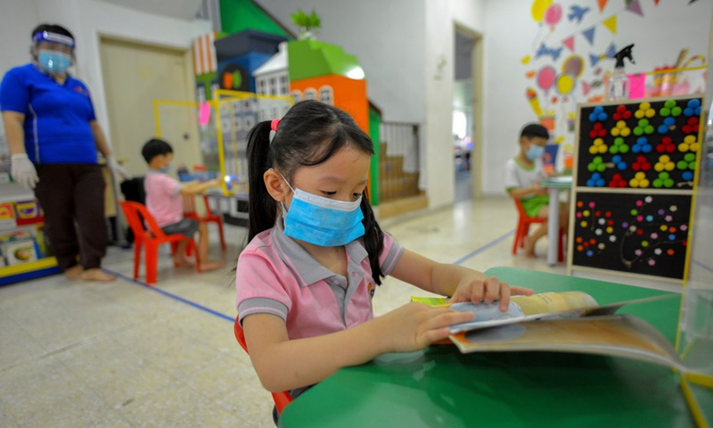 A child wearing a face mask reads a book at a kindergarten in Kuala Lumpur, Malaysia, July 1, 2020. (Photo by Chong Voon Chung/Xinhua)