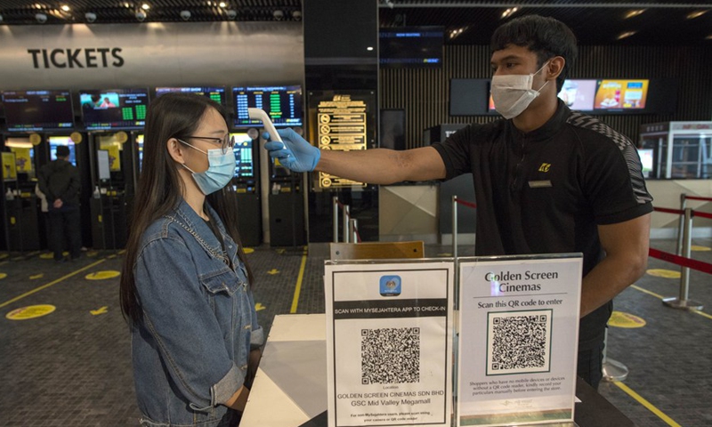 A movie viewer has her temperature checked at a cinema in Kuala Lumpur, Malaysia, July 1, 2020. (Photo by Chong Voon Chung/Xinhua)