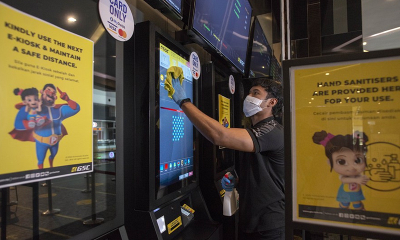 A staff member cleans a ticket machine at a cinema in Kuala Lumpur, Malaysia, July 1, 2020. (Photo by Chong Voon Chung/Xinhua)