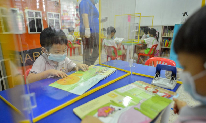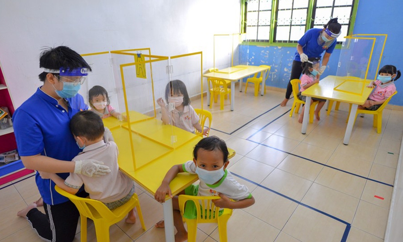 Children are taken care of at a kindergarten in Kuala Lumpur, Malaysia, July 1, 2020. (Photo by Chong Voon Chung/Xinhua)