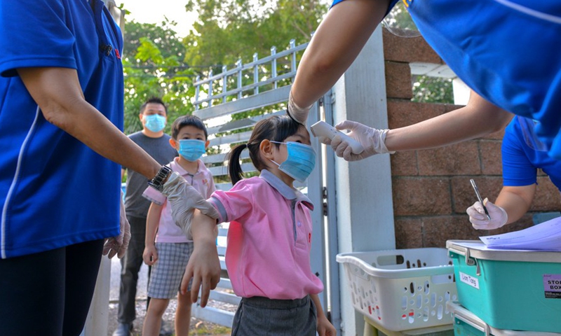 A girl has her temperature checked before entering classroom at a kindergarten in Kuala Lumpur, Malaysia, July 1, 2020. (Photo by Chong Voon Chung/Xinhua)