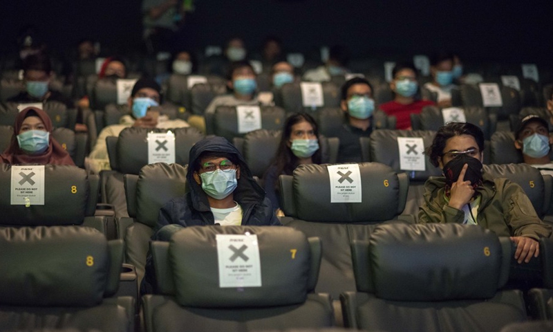 People watch a movie at a cinema in Kuala Lumpur, Malaysia, July 1, 2020. (Photo by Chong Voon Chung/Xinhua)