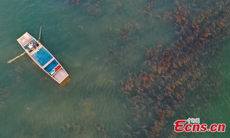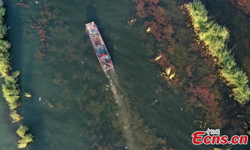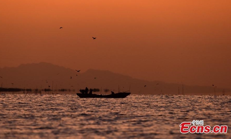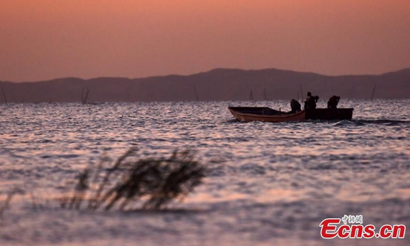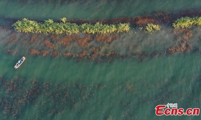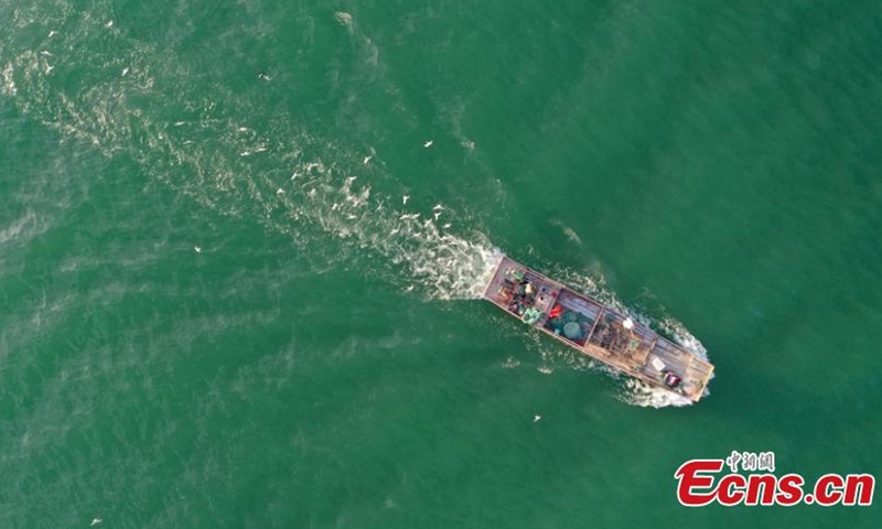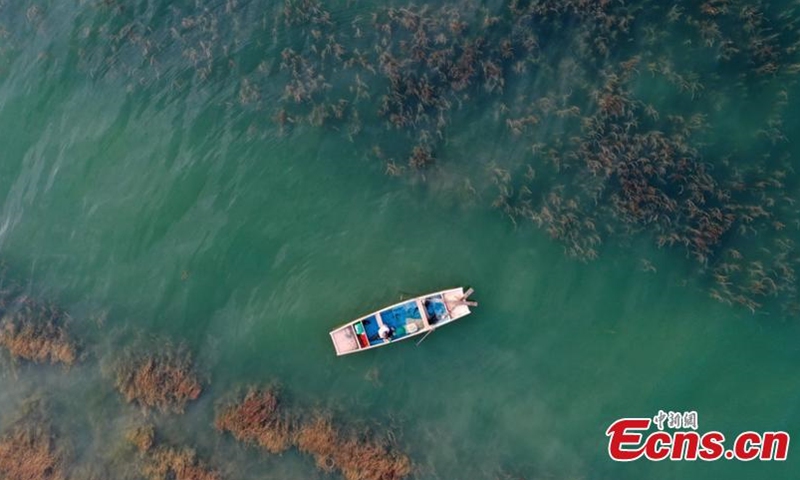 Aerial photo taken on July 1, 2020 shows a fishing boat sailing on the Bosten Lake in Bohu County, northwest China's Xinjiang Uygur Autonomous Region, after the 4-month fishing ban. Bosten Lake is China's largest inland freshwater lake and the biggest fishery base in Xinjiang.