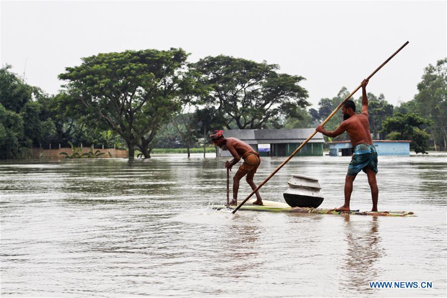 Two men wade through floodwater in Jamalpur, Bangladesh on July 2,2020. Flood caused by heavy rains has seriously affected some parts of Bangladesh. (Xinhua)