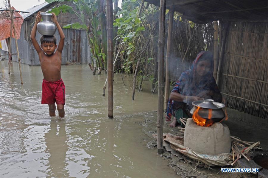 A woman cooks on an earthen oven as a boy stands in floodwater in Jamalpur, Bangladesh on July 2,2020. Flood caused by heavy rains has seriously affected some parts of Bangladesh. (Xinhua)