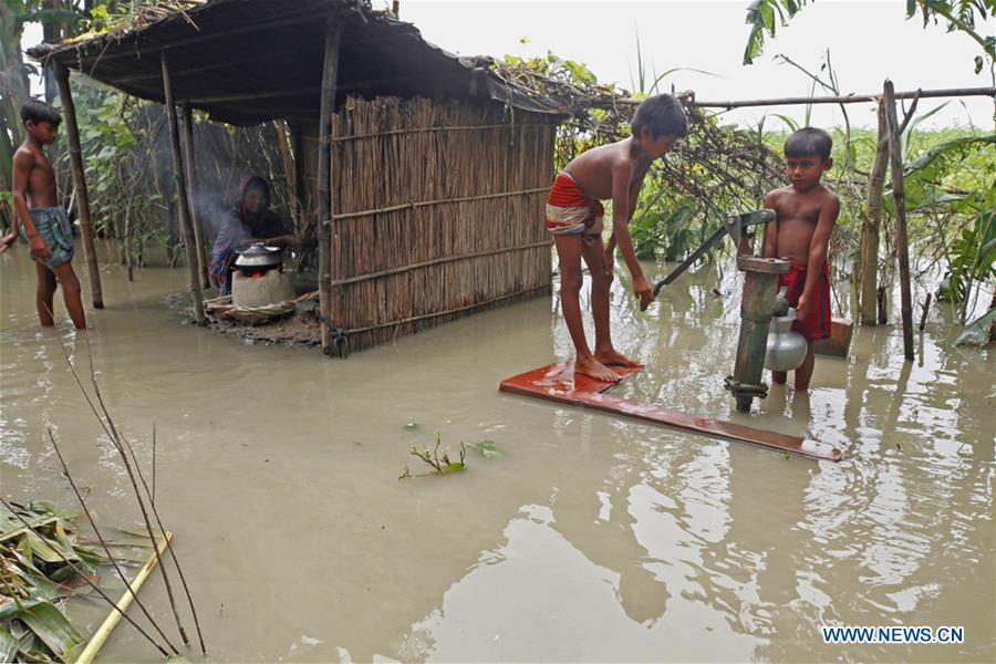 Children collect water from a well in Jamalpur, Bangladesh on July 2, 2020. Flood caused by heavy rains has seriously affected some parts of Bangladesh. (Xinhua)