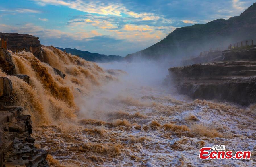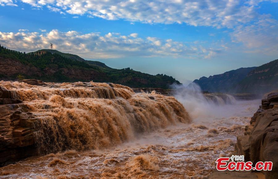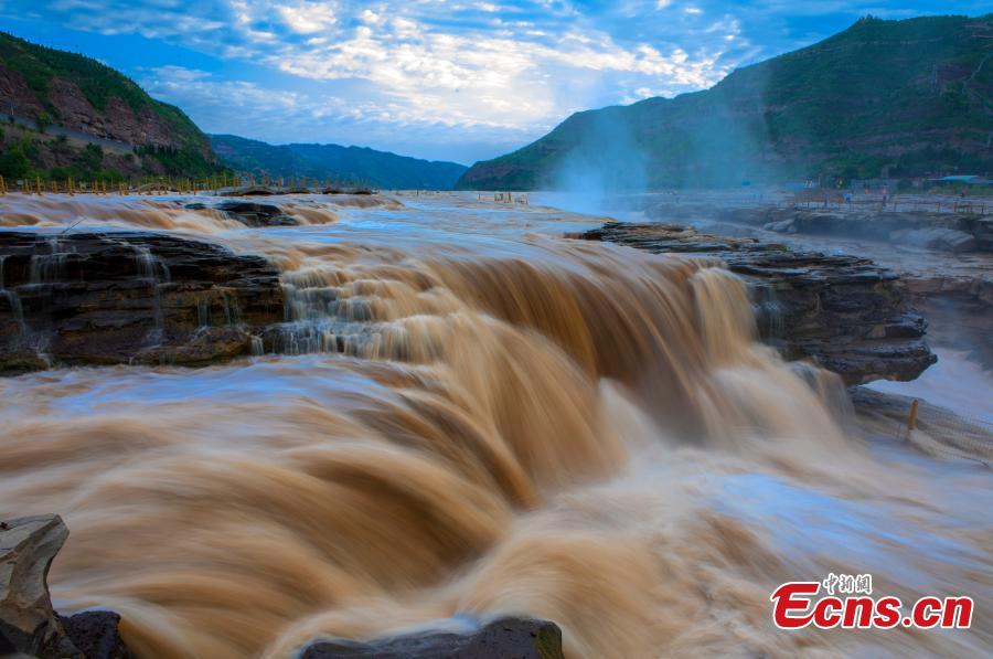 People take photos at the Hukou Waterfall scenic spot in Linfen, north China's Shanxi Province, July 2, 2020. (Photo/China News Service)