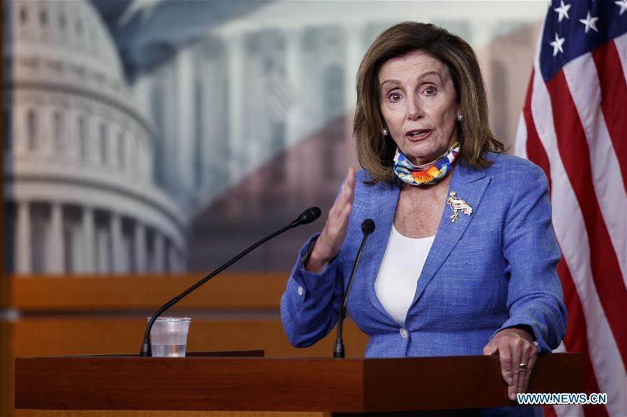 U.S. House Speaker Nancy Pelosi speaks during a press conference on Capitol Hill in Washington D.C., the United States, July 2, 2020. The United States should restore sanctions against Russian intelligence and defense sectors, House Speaker Nancy Pelosi said Thursday after being briefed by top intelligence officials on the Russian-Taliban bounty intelligence. (Photo by Ting Shen/Xinhua)