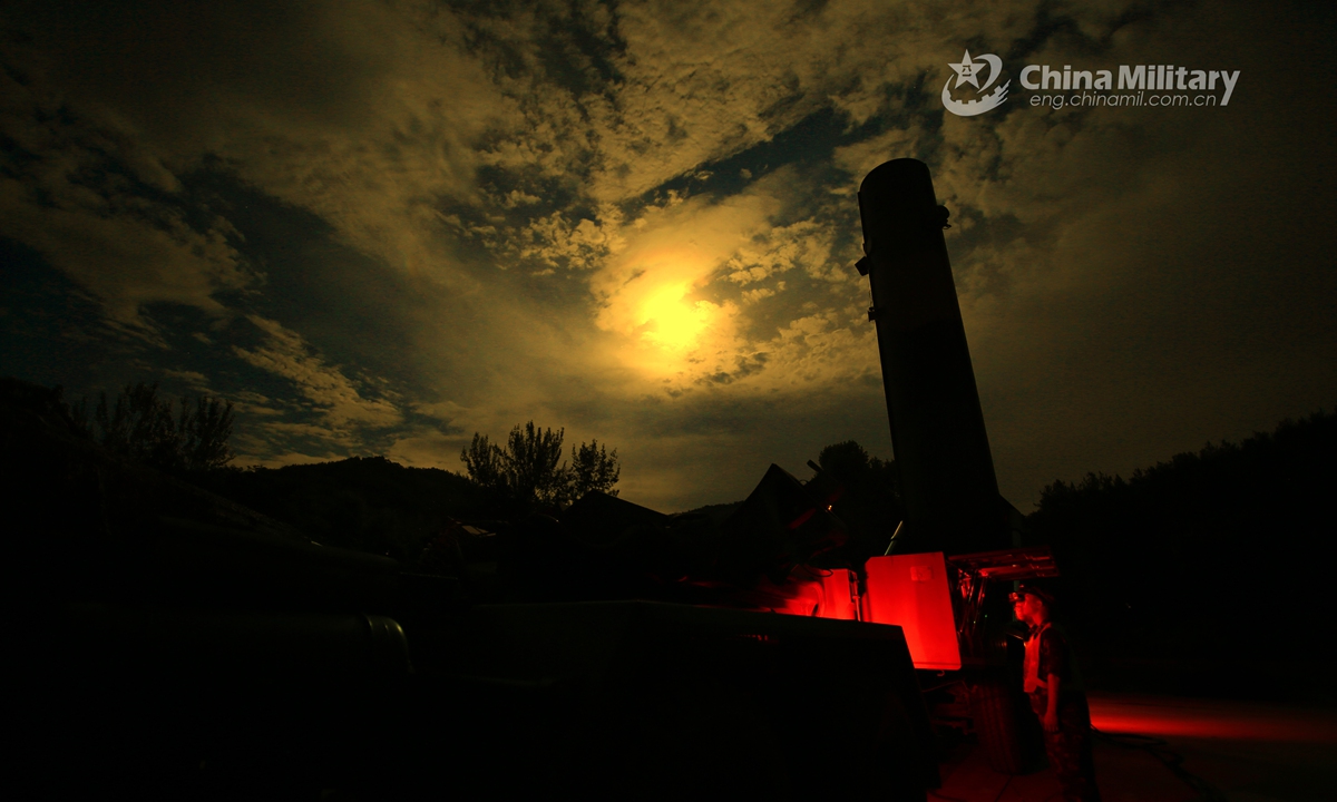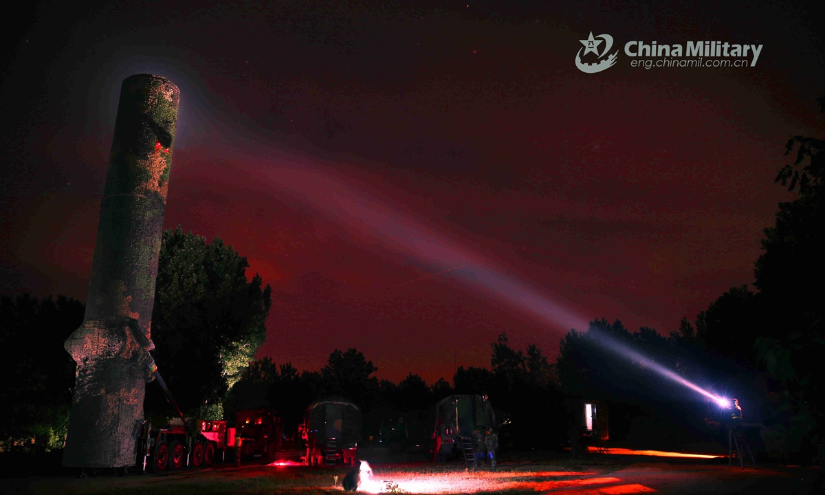 Truck-mounted ballistic missile attached to a brigade under the PLA Rocket Force is erected during a recent realistic training exercise at night without scenario planning. Photo:China Military