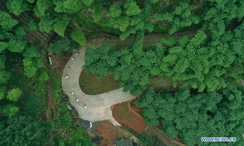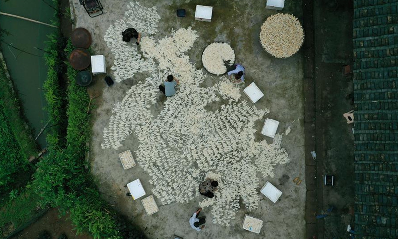 Aerial photo taken on July 4, 2020 shows villagers drying bamboo fungus at Liangjiang Village in Chishui City, southwest China's Guizhou Province. Taking advantage of local bamboo resources, Chishui city has been leading local farmers to plant bamboo fungus in bamboo forests in recent years, as a way to boost their income. (Photo by Wang Changyu/Xinhua)