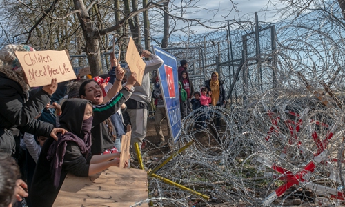 Migrants hold placards as they demonstrate, waiting at the buffer zone in front of the Pazarkule border crossing to Greece, in Edirne, Turkey on Tuesday. Photo: AFP