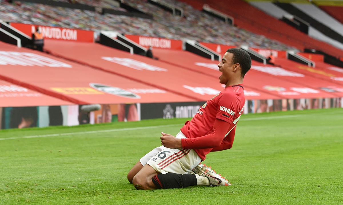 Manchester United striker Mason Greenwood celebrates scoring their fourth goal against Bournemouth on Saturday in Manchester, England. Photo: VCG