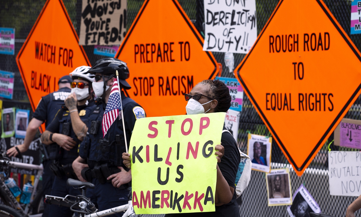 Angela Moore (center), holds a US flag upside down and a sign that reads "Stop Killing" in front of Lafayette Square near the White House in Washington DC, the US on Saturday. Photo: AFP