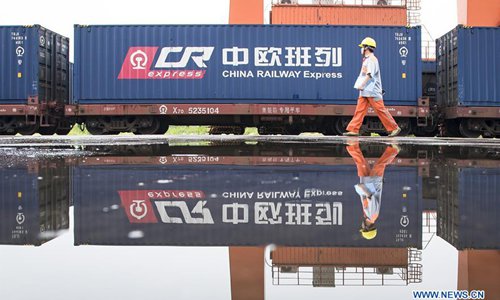 The freight train X8044 from Hamburg of Germany arrives at Wujiashan railway container center station in Wuhan, central China's Hubei Province, Aug. 26, 2018. As the freight train X8044 arrived in Wuhan, China-Europe freight trains have made 10,000 trips since 2011. (Xinhua/Xiao Yijiu)