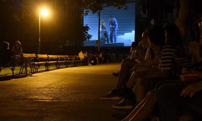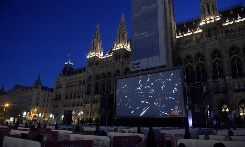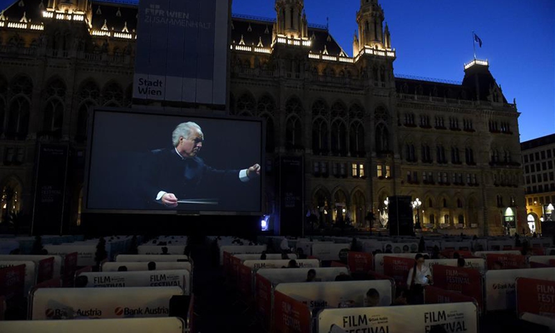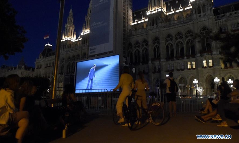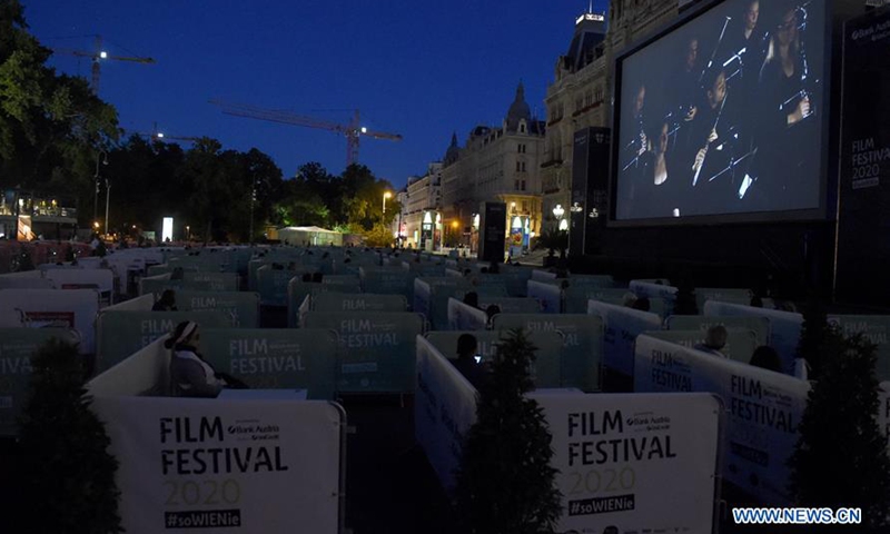 The audience watches the Beethoven's Fidelio in separate boxes during the Film Festival at Vienna's Rathausplatz, Austria, on July 4, 2020. This year's Film Festival at Vienna's Rathausplatz opened on Saturday. (Xinhua/Guo Chen)