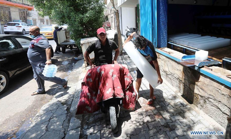 Customers buy ice blocks from an ice-making workshop in Baghdad, Iraq, on July 5, 2020. As the temperature approaches 50 degrees Celsius in Baghdad, ice-making business here thrives with the increasing demand for ice blocks. (Xinhua)