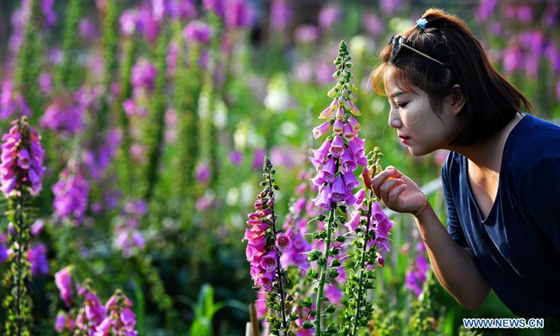 A woman visits the Lupin flower industrial park in Qilichuan Village, Taibai County of northwest China's Shaanxi Province, July 4, 2020. (Xinhua/Liu Xiao)