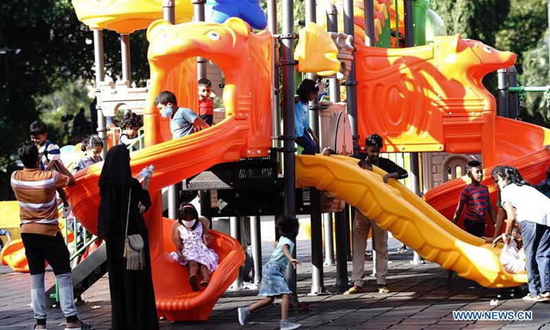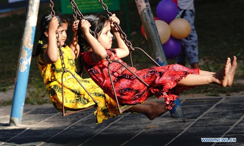 Children have fun at a playground in Viharamahadevi Park in Colombo, Sri Lanka, June 5, 2020. The Viharamahadevi Park has attracted many citizens during the weekend. All national parks, zoos and botanical gardens in Sri Lanka reopened to public on June 15 after being shut since late March due to the COVID-19 pandemic. (Xinhua/Tang Lu)