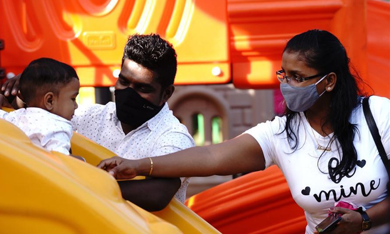 A baby is seen on a slide with his parents at a playground in Viharamahadevi Park in Colombo, Sri Lanka, June 5, 2020. The Viharamahadevi Park has attracted many citizens during the weekend. All national parks, zoos and botanical gardens in Sri Lanka reopened to public on June 15 after being shut since late March due to the COVID-19 pandemic. (Xinhua/Tang Lu)