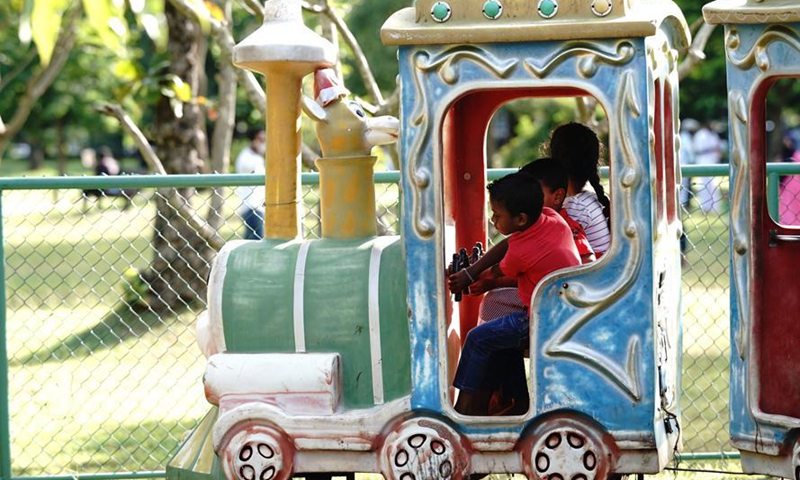 Children have fun on a children's train in Viharamahadevi Park in Colombo, Sri Lanka, June 5, 2020. The Viharamahadevi Park has attracted many citizens during the weekend. All national parks, zoos and botanical gardens in Sri Lanka reopened to public on June 15 after being shut since late March due to the COVID-19 pandemic. (Xinhua/Tang Lu)