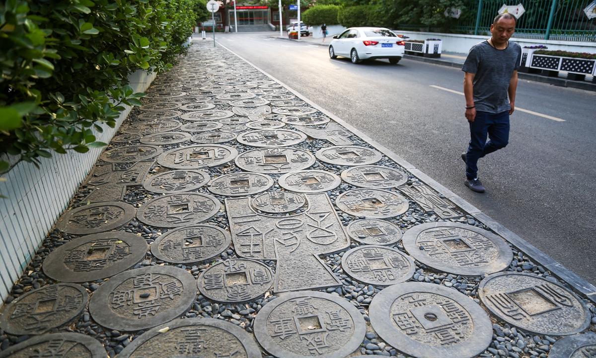 A 150-meter-long pavement in Zhengzhou, Central China's Henan Province, is paved with bricks shaped like coins from different dynasties in Chinese history, allowing pedestrians to walk on a "road of money." Photo: IC