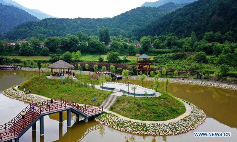 Aerial photo taken on July 5, 2020 shows people visiting Baiyun Village, Taibai County of northwest China's Shaanxi Province. Baiyun Village, located in the deep of the Qinling Mountains, had long been a underdeveloped area with people living in poverty. In recent years, by promoting rural tourism and agricultural products, the village has lifted all of its people out of poverty. (Xinhua/Liu Xiao)