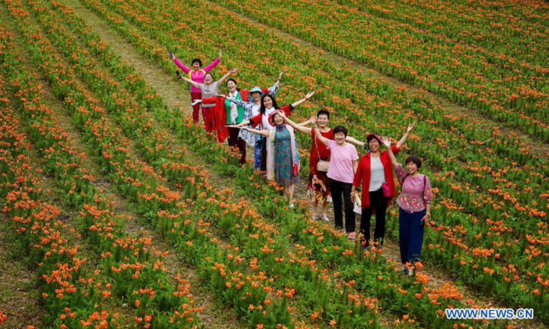 Photo taken on July 5, 2020 shows people visiting lily fields in Baiyun Village, Taibai County of northwest China's Shaanxi Province. Baiyun Village, located in the deep of the Qinling Mountains, had long been a underdeveloped area with people living in poverty. In recent years, by promoting rural tourism and agricultural products, the village has lifted all of its people out of poverty. (Xinhua/Liu Xiao)
