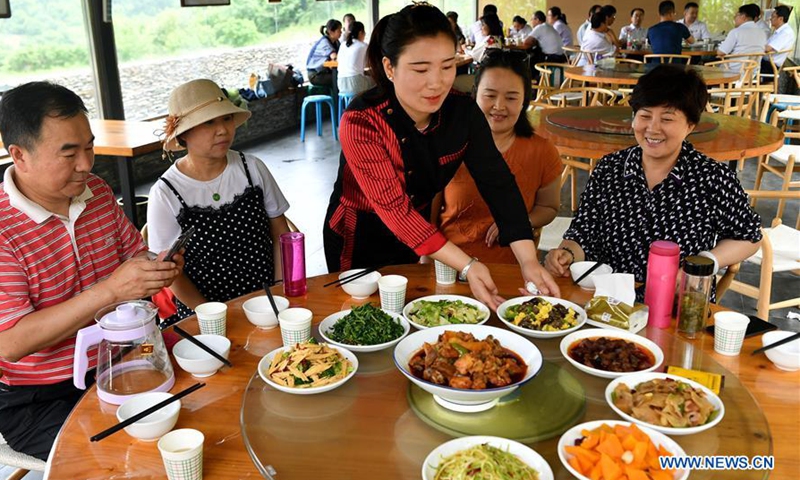 Tourists have lunch at a farm stay in Baiyun Village, Taibai County of northwest China's Shaanxi Province, July 5, 2020. Baiyun Village, located in the deep of the Qinling Mountains, had long been a underdeveloped area with people living in poverty. In recent years, by promoting rural tourism and agricultural products, the village has lifted all of its people out of poverty. (Xinhua/Liu Xiao)