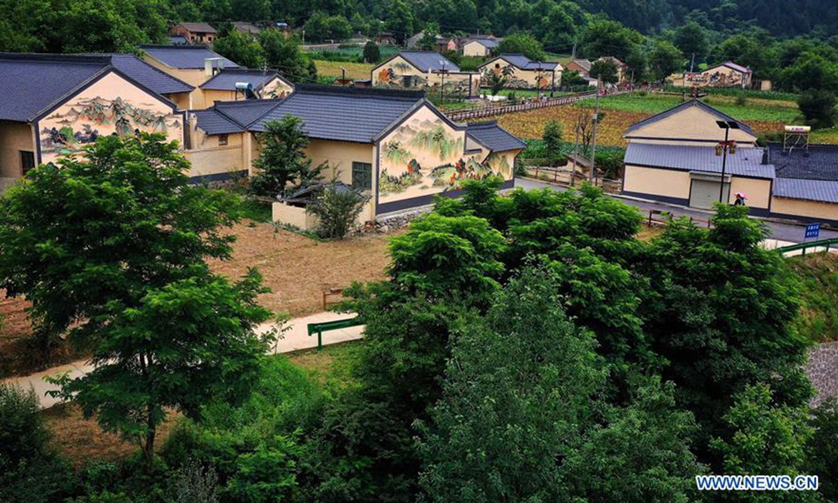 Aerial photo taken on July 5, 2020 shows farm stays in Baiyun Village, Taibai County of northwest China's Shaanxi Province. Baiyun Village, located in the deep of the Qinling Mountains, had long been a underdeveloped area with people living in poverty. In recent years, by promoting rural tourism and agricultural products, the village has lifted all of its people out of poverty. (Xinhua/Liu Xiao)