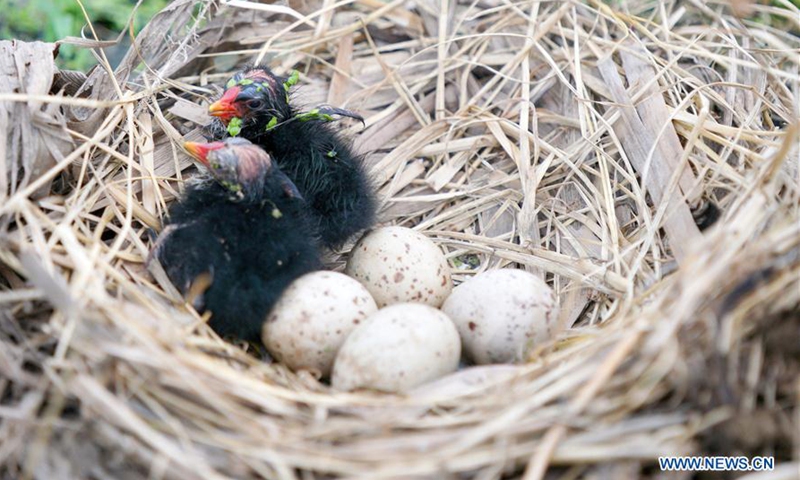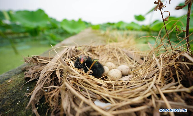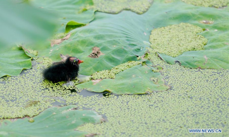 A moorhen chick rests in a nest near a pond of Xingtai, north China's Hebei Province, July 7, 2020. (Xinhua/Mu Yu)