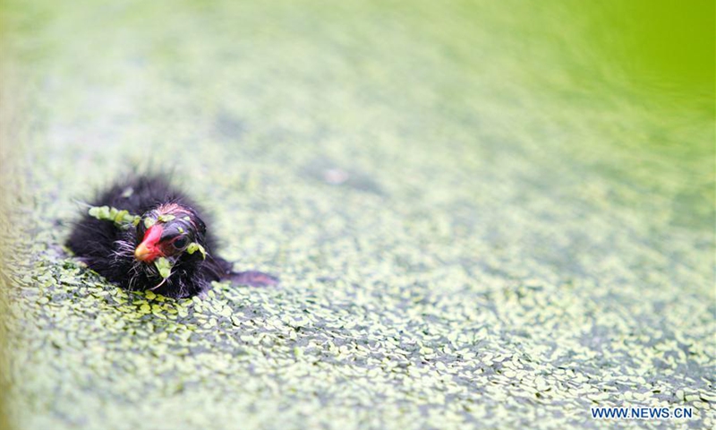 A moorhen chick swims in a pond of Xingtai, north China's Hebei Province, July 7, 2020. (Xinhua/Mu Yu)