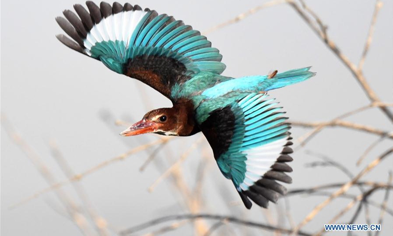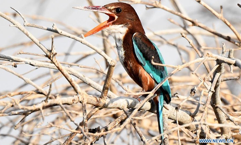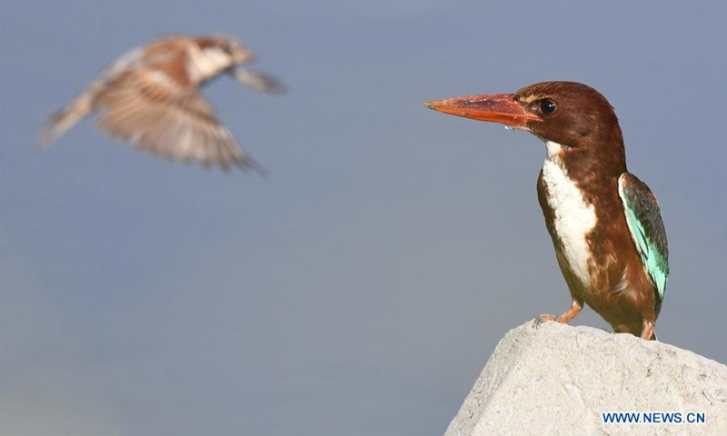 A white-throated kingfisher is seen at a beach in Kuwait City, Kuwait, July 7, 2020. (Photo by Ghazy Qaffaf/Xinhua)