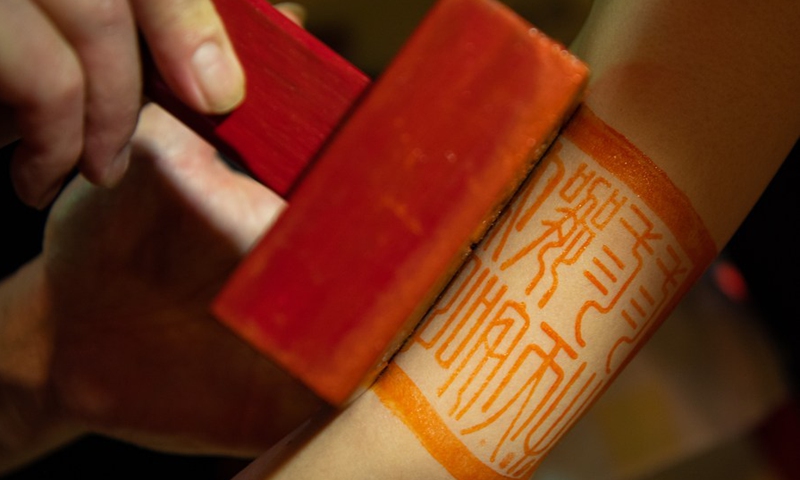 A staff member stamps a Na Tcha figure on an arm of a resident during a ceremony to pray for good fortune at Na Tcha Temple in Macao, south China, July 7, 2020. (Xinhua/Cheong Kam Ka)