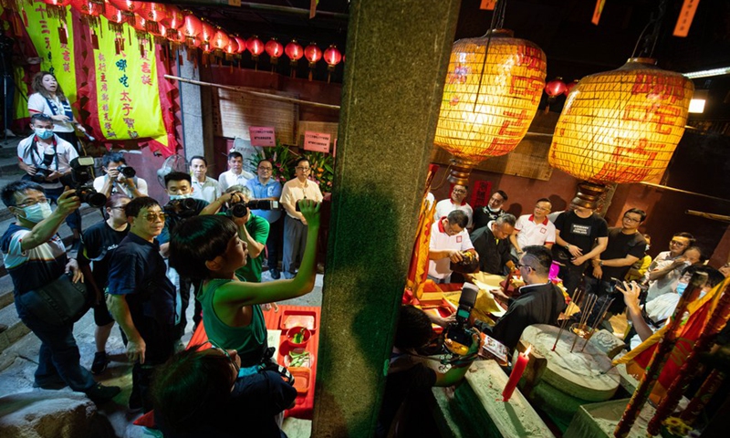 People attend a ceremony to pray for good fortune at Na Tcha Temple in Macao, south China, July 7, 2020. (Xinhua/Cheong Kam Ka)