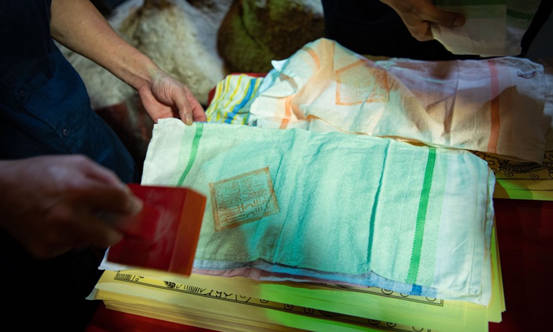 A staff member stamps a Na Tcha figure on towels for residents during a ceremony to pray for good fortune at Na Tcha Temple in Macao, south China, July 7, 2020. (Xinhua/Cheong Kam Ka)