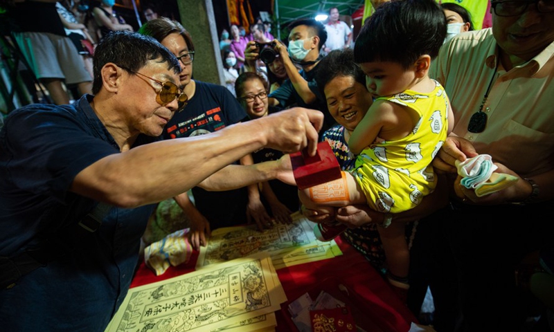 A staff member stamps a Na Tcha figure on a leg of a child during a ceremony to pray for good fortune at Na Tcha Temple in Macao, south China, July 7, 2020. (Xinhua/Cheong Kam Ka)