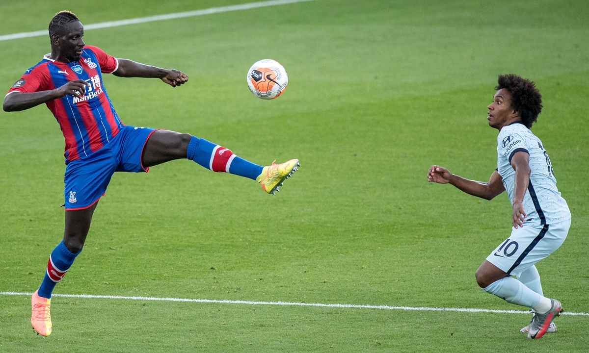 Mamadou Sakho (left) of Crystal Palace reaches for the ball before Willian of Chelsea on Tuesday in London. Photo: VCG