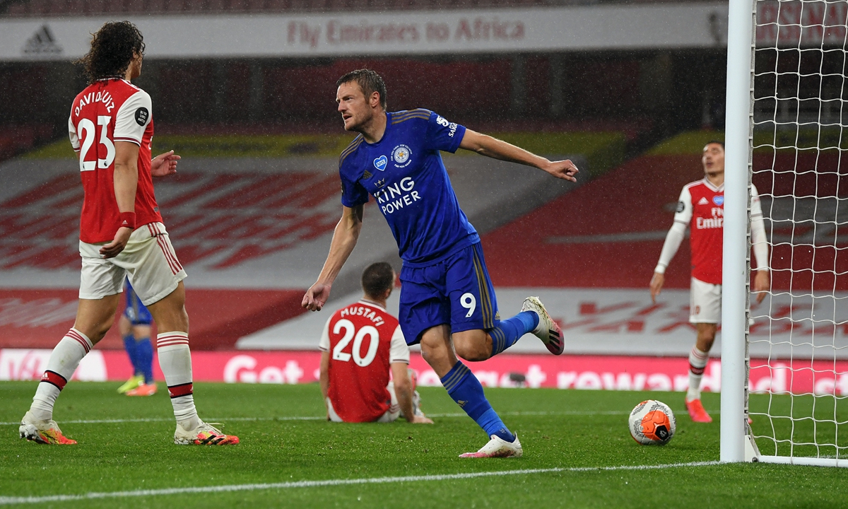 Leicester City's Jamie Vardy scores his side's equalizing goal against Arsenal on Tuesday in London. Photo: VCG