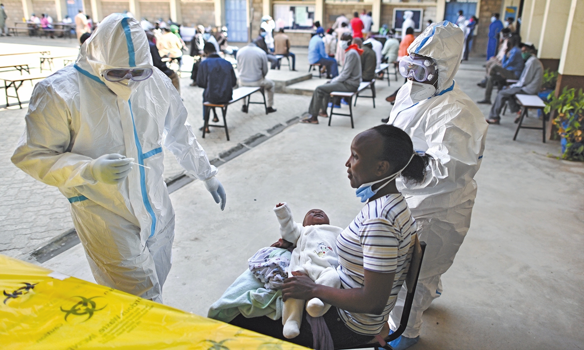 A woman and her infant wait to be tested at a mass testing site for coronavirus in Ruaraka, a densely populated suburb in Nairobi, Kenya on May 28.