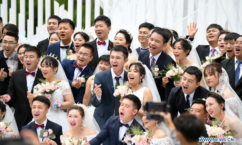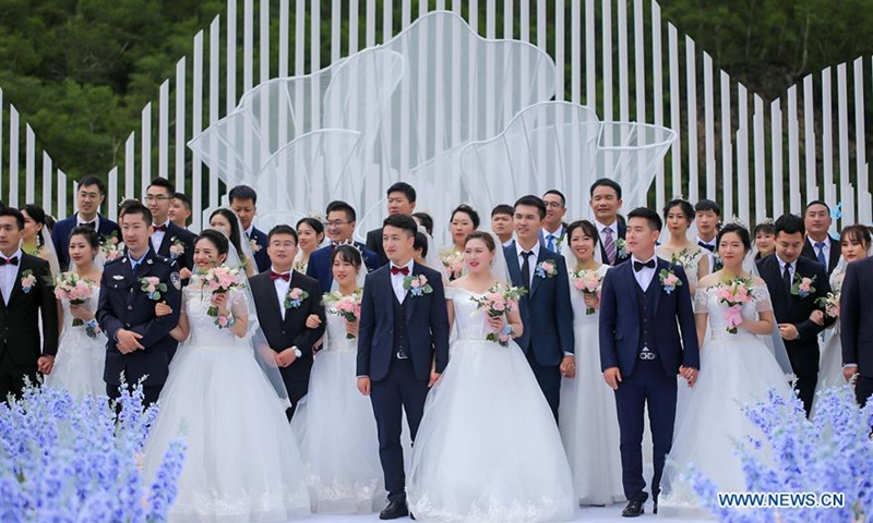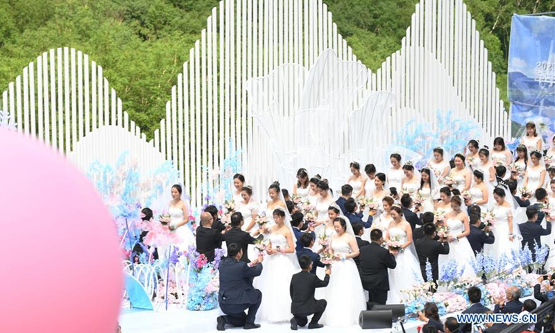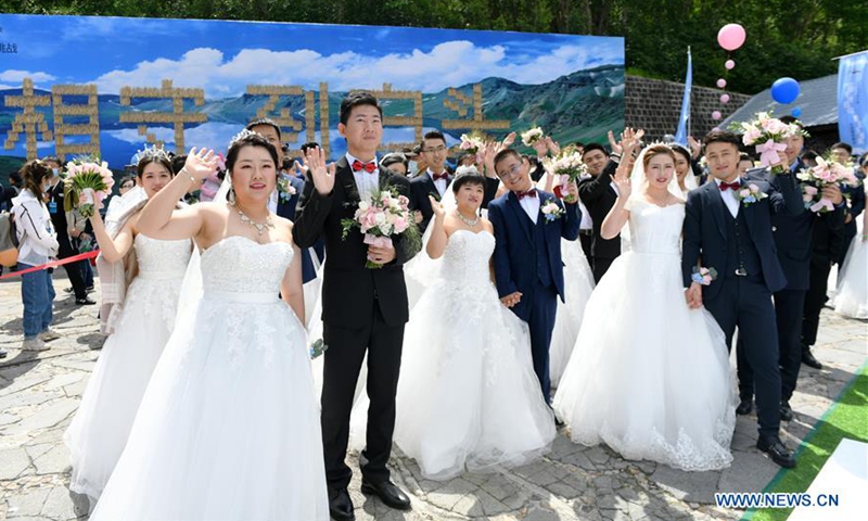 Couples who joined the fight against COVID-19 take part in a group wedding held by the management committee of Changbai Mountain in northeast China's Jilin Province, July 8, 2020. The group wedding was held for 50 couples from around the country who had joined the fight against COVID-19 and postponed their own weddings. (Xinhua/Lin Hong)