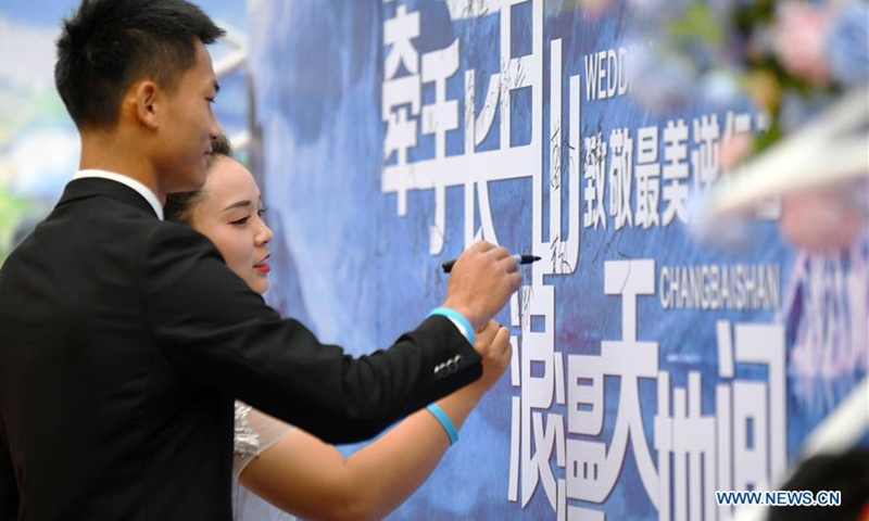 A couple who joined the fight against COVID-19 sign their names during a group wedding held by the management committee of Changbai Mountain in northeast China's Jilin Province, July 8, 2020. The group wedding was held for 50 couples from around the country who had joined the fight against COVID-19 and postponed their own weddings. (Xinhua/Lin Hong)
