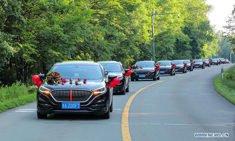Couples who joined the fight against COVID-19 take cars to participate in a group wedding held by the management committee of Changbai Mountain in northeast China's Jilin Province, July 8, 2020. The group wedding was held for 50 couples from around the country who had joined the fight against COVID-19 and postponed their own weddings. (Xinhua/Lin Hong)