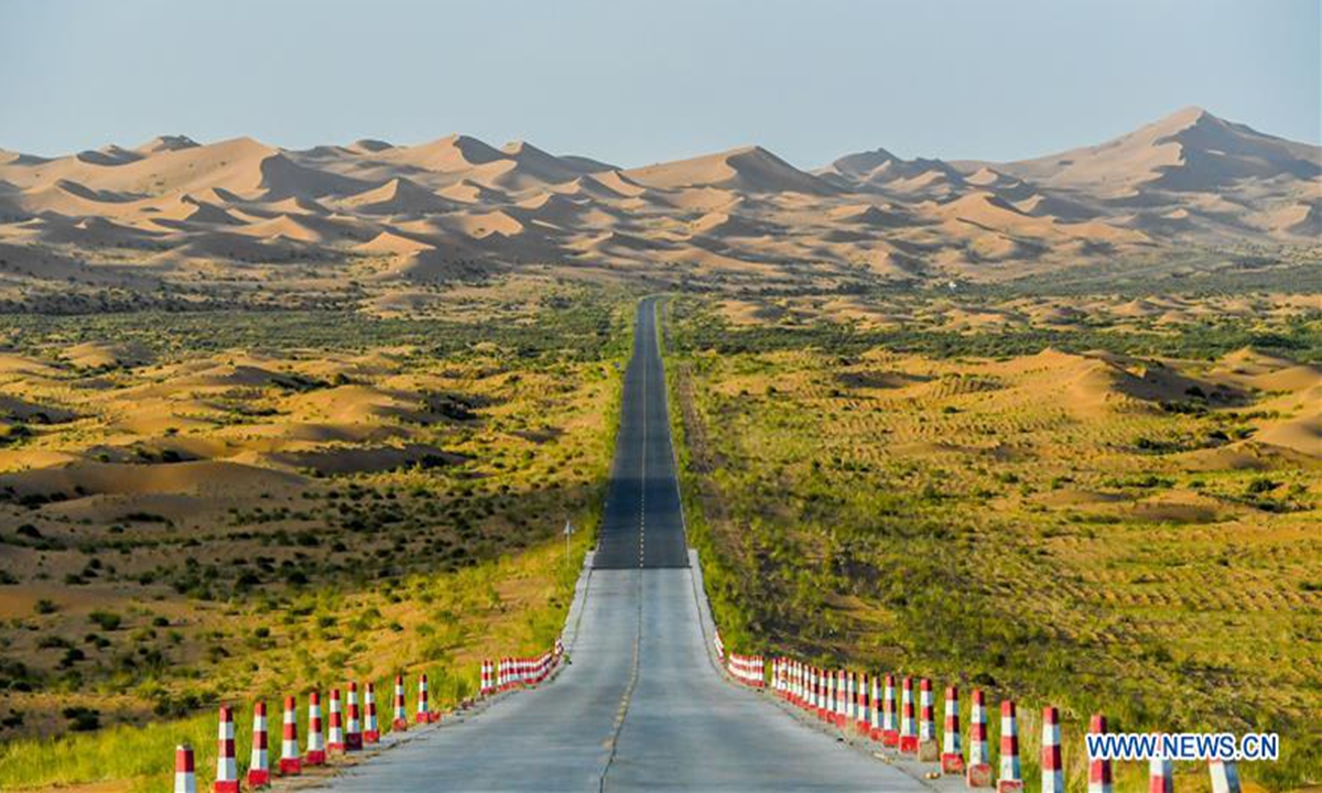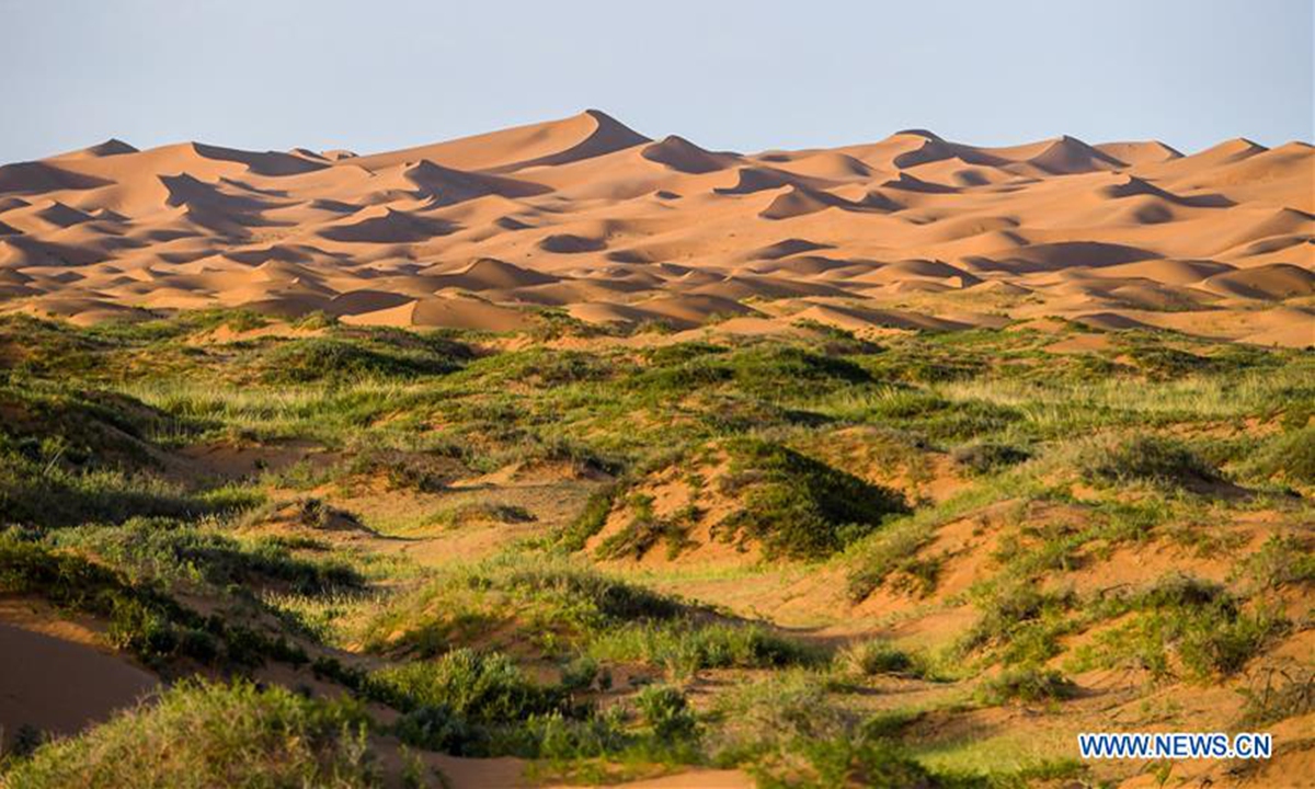 Photo taken on July 8, 2020 shows the scenery of Tengger Desert in Alxa Left Banner, north China's Inner Mongolia Autonomous Region. Tengger Desert, covering an area of about 43,000 square kilometers, is the fourth largest desert in China. (Xinhua/Lian Zhen)
