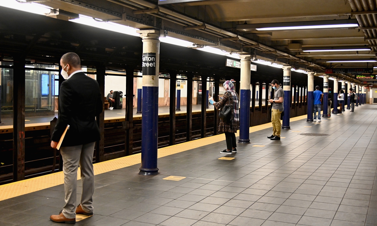 Commuters social distance while waiting for a train at the Fulton Street subway station and complex on Tuesday in lower Manhattan in New York City. Photo: AFP