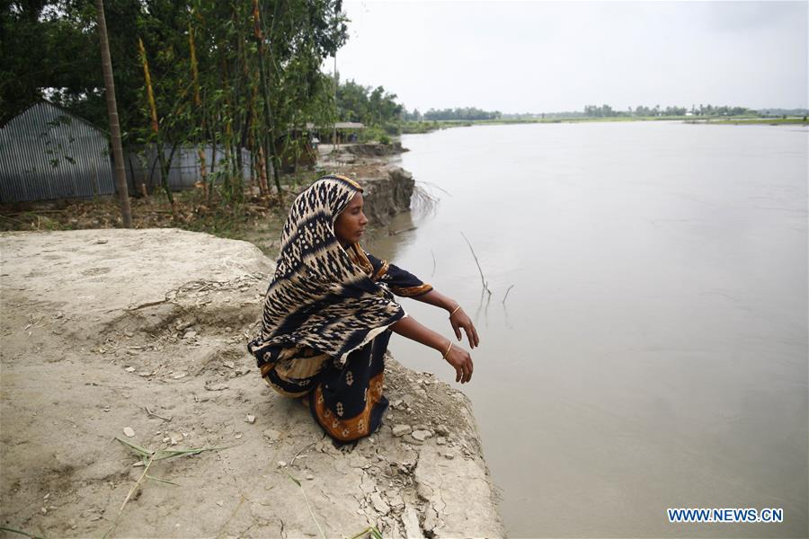 A woman sits on the bank next to the site where her house has been washed away along a river in Manikganj district, some 63 km northwest of capital Dhaka, Bangladesh, July 9, 2020. Flooding caused by heavy rains and the onrush of water from hills have seriously affected the villagers here. (Xinhua)
